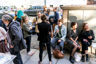 Previous ImageNext Image 20200917_blauer-sand_-11 Auch vor dem blauen Sand gute Stimmung bei Abendsonne zur Eröffnung der Ausstellung.