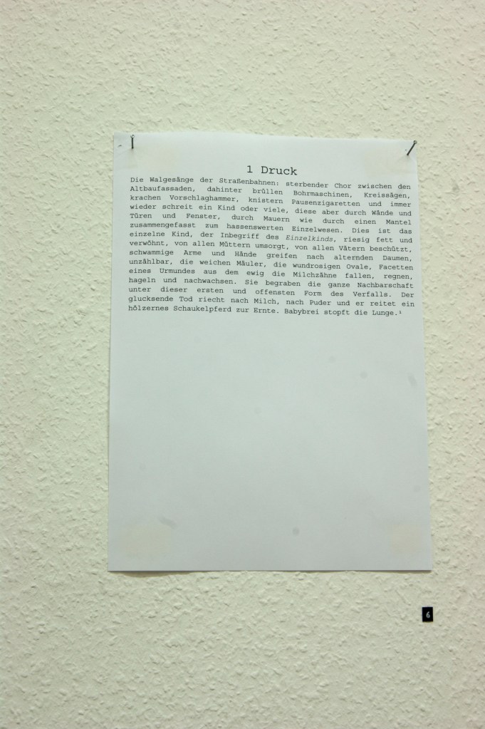 Teil der Ausstellung waren nicht nur Bildwerke, sondern auch die Textfragmente von Felix, die ihrerseits bei der Ausstellung grafische Qualität mit Poesie vereinten und das gestalterisch-verbindende Moment der Hängung im Raum darstellten.