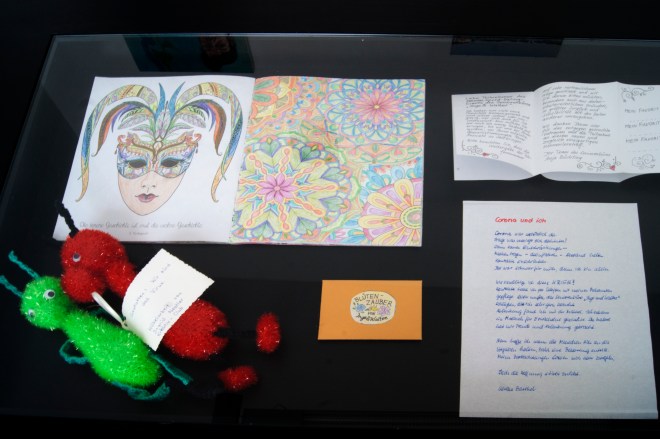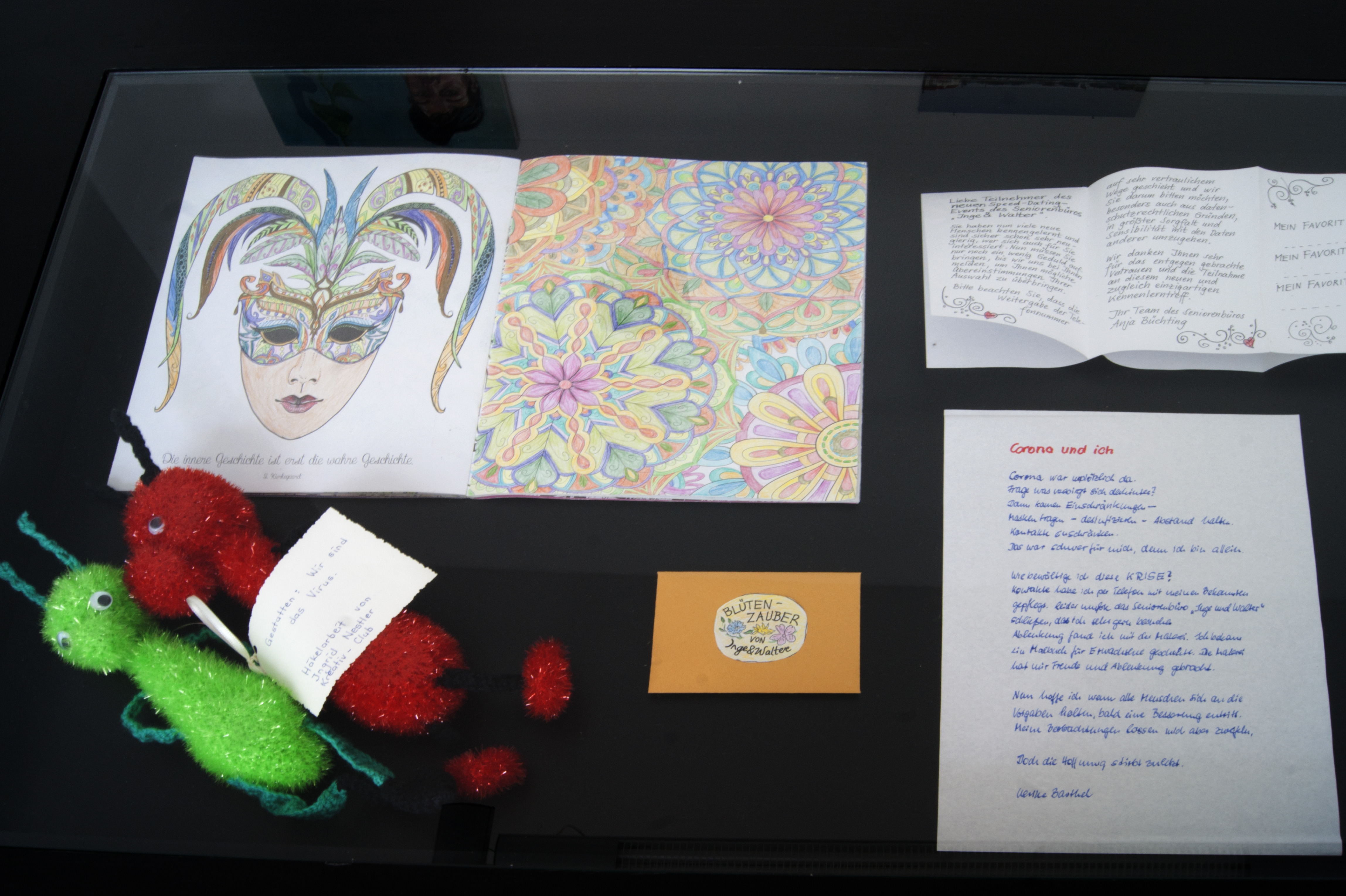 Tisch, handgefertigte Puppen mit beschriebenen Zettel “ Gestatten: Wir sind das Virus. Häkelarbeit von Ingrid Nestler Kreativclub „, ein von Ulrike Barthel gestaltetes Malbuch für Erwachsene, zwei durch die Mitarbeiter des Seniorenbüros gestaltete Samentütchen und ein Speed Dating-Heft für Senioren (A5), ein handgeschriebener Text von Ulrike Barthel.