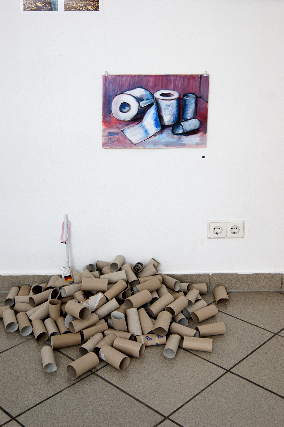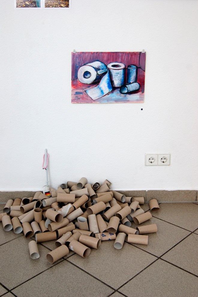 Zusehen ist ein Anhäufung leerer Klopapierrollen, eine an die Wand gelehnte stehende Klobürste mit Deutschlandfahne auf dem Etikett und eine darüber gehängte Malerei mit Klopapierrollen-Stillleben von Max Schiesl